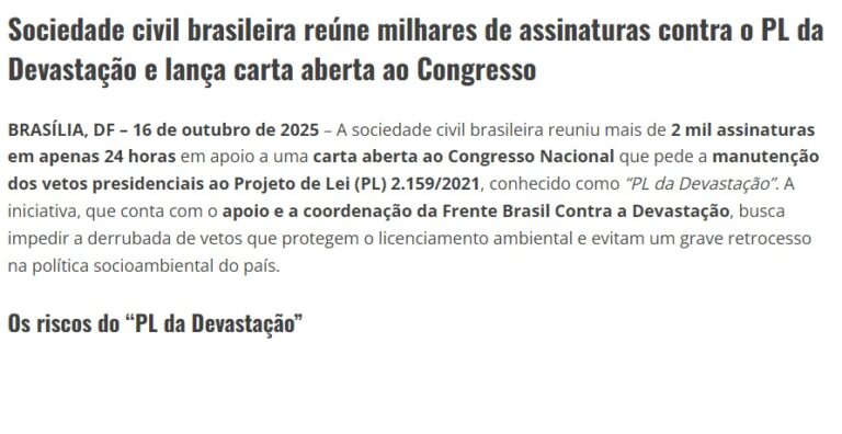 Sociedade civil brasileira reúne milhares de assinaturas contra o PL da Devastação e lança carta aberta ao Congresso
